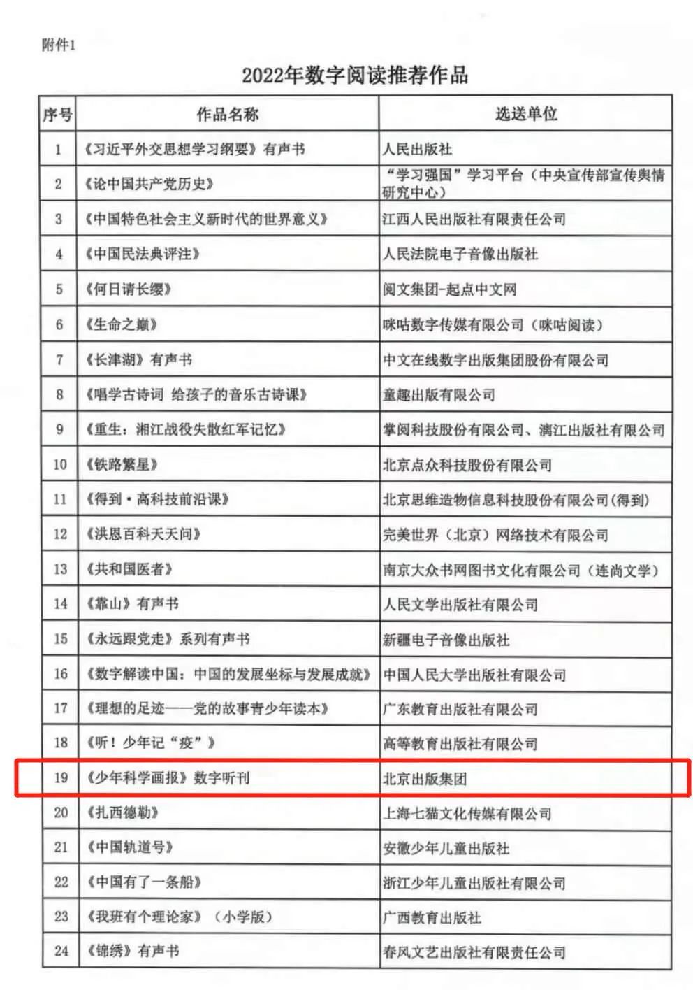 7月19日,中国音像与数字出版协会公布了“2022年数字阅读推荐作品”结果,北京出版集团《少年科学画报》数字听刊成功入选。
