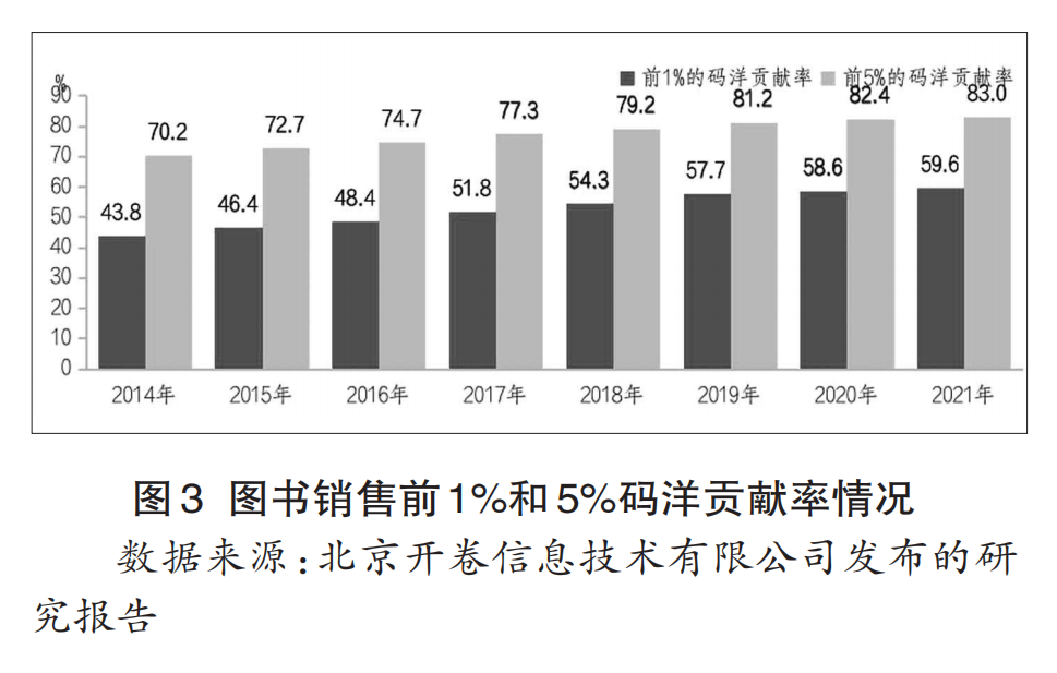 近年来,图书产品经营的头部化趋势不断强化并走向极端。开卷数据显示,2014年销售前1%的图书,其销售码洋贡献率为44%;2021年则达到59.6%。2014年销售前5%的图书,其销售码洋贡献率为70%;2021年则达到83%。出版行业“二八法则”已经严重极化,成为了“零五八零法则”。2021年全行业所出版发行的图书,前5%的图书品种创造了80%以上的销售。换句话说,95%的图书品种,仅创造了17%的销售码洋,绝大多数图书产品是低效产品(见图3)。